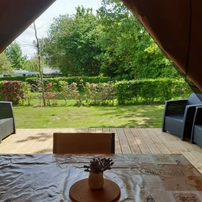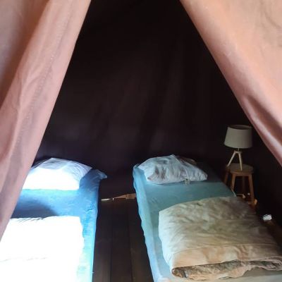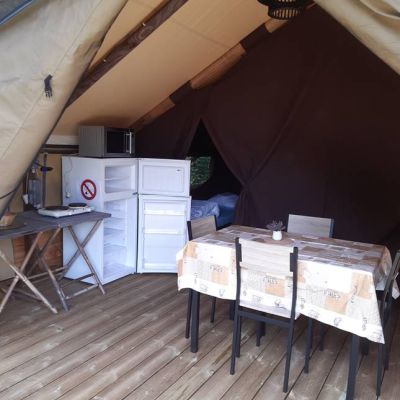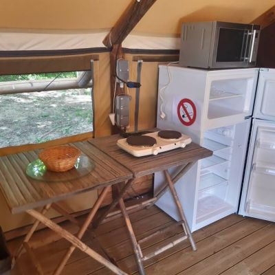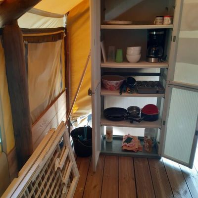 Dans cette tente, il n’y a pas d’eau, il faut utiliser les sanitaires du camping.